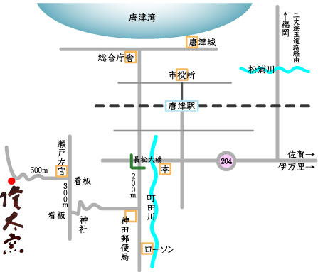 唐津駅(南口)より、タクシーにて15分ほど。